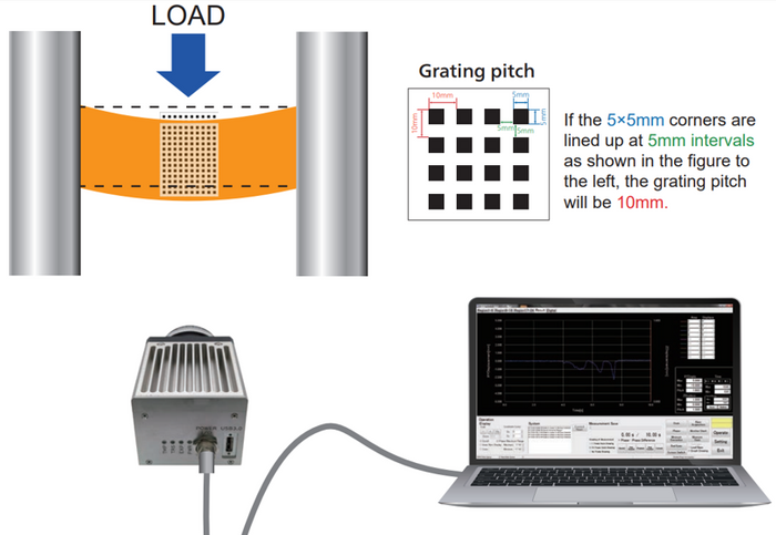 - Digital image processing to calculate the displacement from changes in the moiré pattern